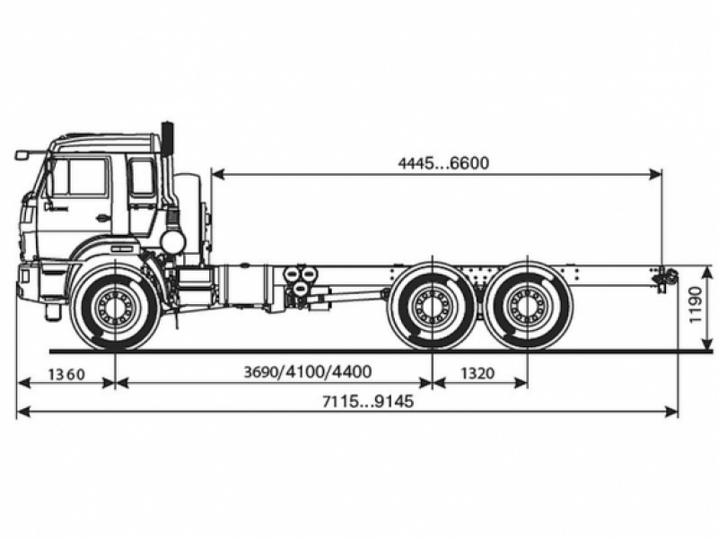 Шасси 6*4, длина рамы 5 970 мм, межосевое растояние мм, грузоподъемность 12 тонн
